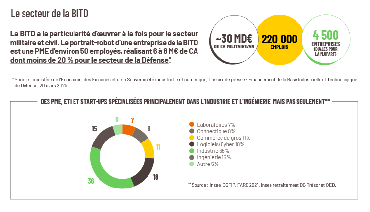 La France dispose d’une Base Industrielle et Technologique de Défense (« BITD ») qui soutient un modèle d’armée complet unique en Europe. Cet écosystème français est structuré autour de 9 grands groupes d’envergure mondiale : Arianespace, Airbus, Dassault Aviation, Safran, Thales, MBDA, Arquus, KNDS et Naval Group.