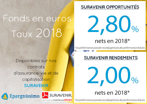 Epargnissimo et Suravenir tirent une fois de plus leur épingle du jeu avec des rendements exceptionnels en 2018 pour les fonds en euros, présents sur nos contrats d'assurance-vie et de capitalisation Croissance Avenir(4) et Croissance Avenir Capitalisation(4), Croissance Vie(4) et Croissance Capitalisation(4).