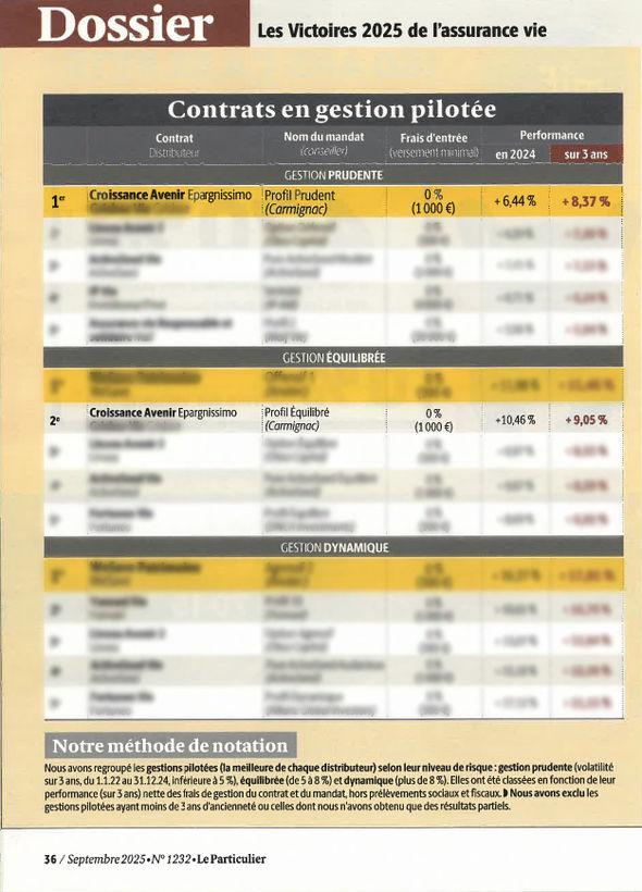 Le magazine Le Particulier a classé le contrat d'assurance-vie Croissance Avenir(1), commercialisé en exclusivité par Epargnissimo, à la 1ère place des meilleurs contrats d'assurance-vie de 2025 en gestion pilotée, catégorie « gestion prudente »(2), lors du concours des Victoires de l’assurance-vie organisé en septembre 2025.