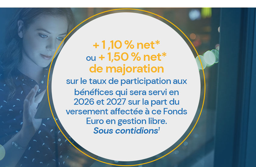 +1,10 % net* sur le taux de participation aux bénéfices du Fonds Euro Nouvelle Génération servi en 2026 et 2027 sur la part du versement affectée à ce Fonds Euro en gestion libre |