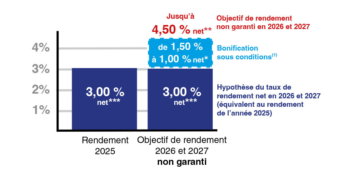Cet objectif de rendement est non garanti et prend comme hypothèse un rendement net hors bonification équivalent au rendement de l’année 2025 (soit 3,00 % net***) associé à une bonification de 1,50 % net* maximum.