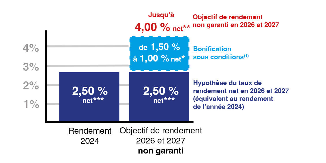 Cet objectif de rendement est non garanti et prend comme hypothèse un rendement net hors bonification équivalent au rendement de l’année 2024 (soit 2,50 % net***) associé à une bonification de 1,50 % net* maximum.