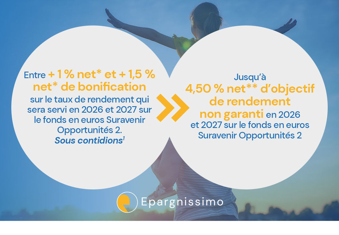 (1) Du 01/01/2026 au 31/03/2026, Suravenir applique une bonification sur le taux de rendement qui sera servi en 2026 et 2027 sur le fonds en euros Suravenir Opportunités 2 en gestion libre. Offre valable pour tout versement d'un montant de 100 000 euros minimum effectué pendant cette période (hors versement programmé et hors versement issu d’un rachat d'un contrat détenu chez Suravenir) : 1,00 % net de bonification pour un versement sans contrainte d’investissement d’unités de compte ou 1,50 % net de bonification pour un versement investi à 40 % minimum en unités de compte (non garanties en capital).