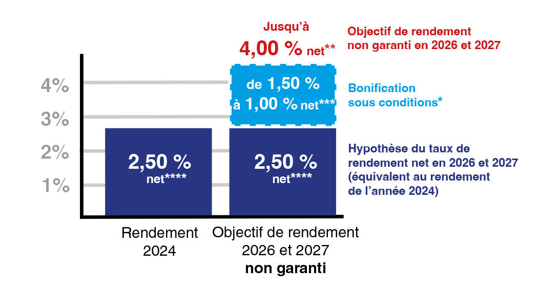 Cet objectif de rendement est non garanti et prend comme hypothèse un rendement net hors bonification équivalent au rendement de l’année 2024 (soit 2,50 % net**) associé à une bonification de 1,50 % net*** maximum.